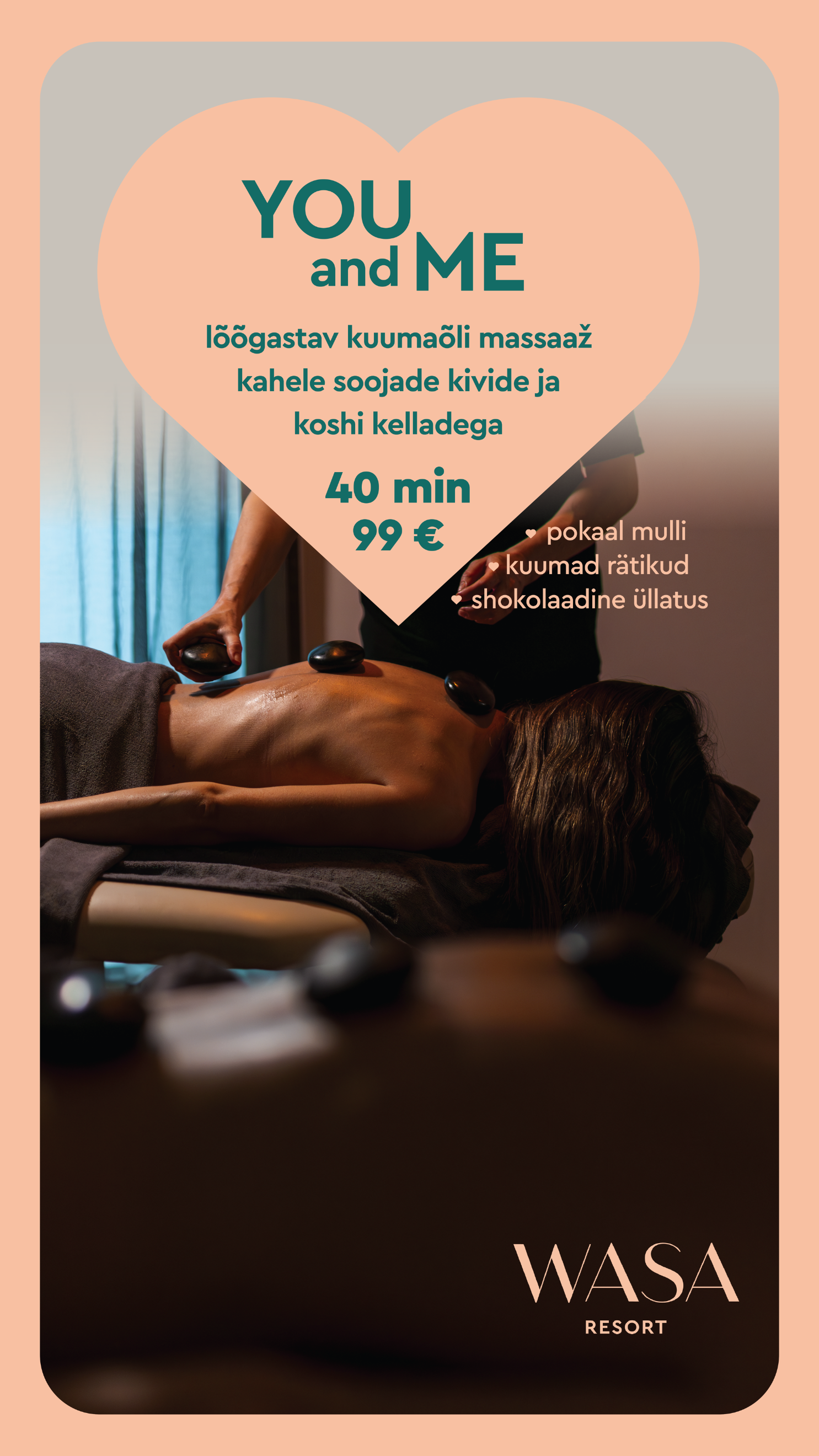 Naudi koos kallimaga hetke, mis on pühendatud ainult teile kahele. „YOU and ME“ on lõõgastav kuumaõli massaaž kahele, mida saadavad soojad kivid ja rahustavad koshi kellade helid.