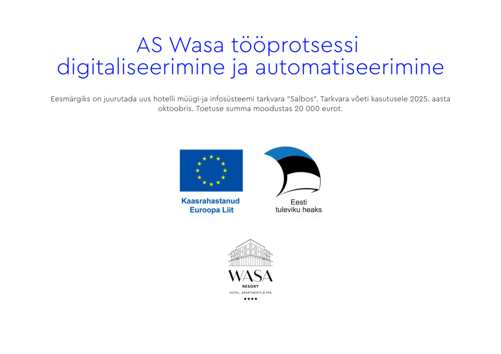 Projekt: 3: AS Wasa tööprotsessi digitaliseerimine ja automatiseerimine. Eesmärgiks on juurutada uus hotelli müügi-ja infosüsteemi tarkvara “Salbos”. Tarkvara võeti kasutusele 2025. aasta oktoobris. Toetuse summa moodustas 20 000 eurot.